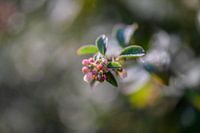 close up van een zomerbloeiende vaste plant die roze besjes krijgt tijdens de bloei, met een grijs groene achtergrond