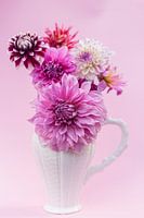 verschillende roze en witte dahlia bloemen in een ouderwetse witte buikvaas voor een roze achtergrond