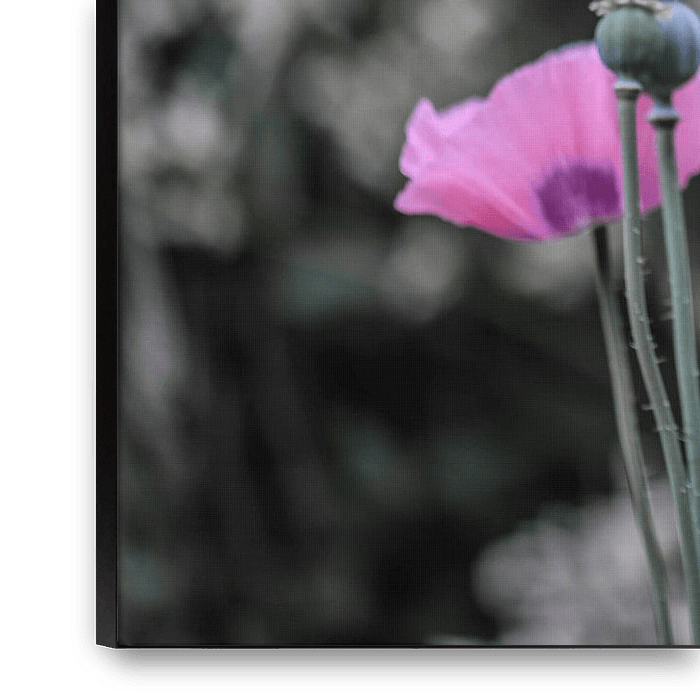 close up van roze klaprozen, waarvan een groot deel al uitgebloeid is, met een bokeh zwart witte achtergrond