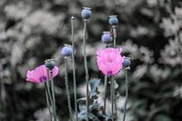 close up van roze klaprozen, waarvan een groot deel al uitgebloeid is, met een bokeh zwart witte achtergrond