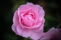 close up van een grote zachtroze roos, met een donkere achtergrond