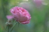 close up van een zachtroze roos, met een zachte groene doffe achtergrond