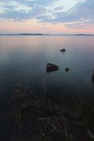 roze water en gletsjerstrepen op rotsen en roze zonsondergang scandinavië, karelia