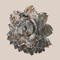 Deze foto was bedoeld als illustratie van de spiraal van Fibonacci die veel voorkomt in de natuur. Hier zie je hem in de plaatsing van de blaadjes aan de stengel van een vetplantje. Om de spiraal beter te kunnen zien heb ik de foto zwart/wit gemaakt en de achtergrond daarna een kleurtje gegeven. Dat was toch een beetje saai, na wat spelen met verschillende foto's van structuren heb ik een foto van korstmossen gebruikt om het bladrozet te vullen.