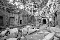 Wortels van een kapokboom overwoekeren de ruïne van de Ta Prohm tempel. Deze tempel is een onderdeel van het tempelcomplex Angkor Wat in Cambodja.
