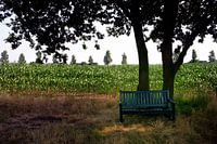 een bankje langs de dommel bij het plaatsje gemonde. hoogzomer; de zon knalt ongenadig op het land. maar dit is een rustpunt in de schaduw. en het kan een rustpunt zijn aan uw muur... dat bankje! wie wil er niet zitten? op de achtergrond een van de mooiste bolle akkers van ons land. met daarop de mais waarvan brabant zo vergeven is. en…