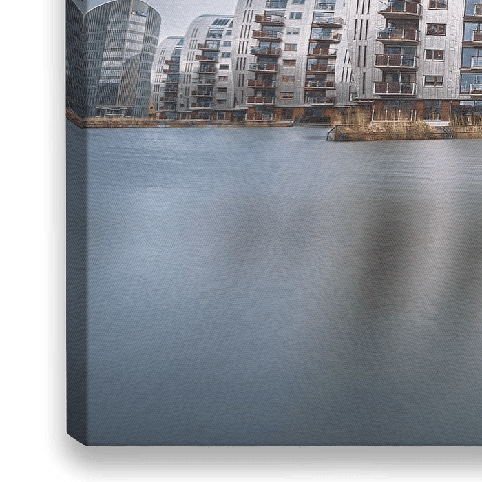 De gebouwen staan aan het water en zijn architectonisch vormgegeven. De foto heeft een lange belichtingstijd, waardoor het water en de wolken een zachte sfeer geven. Dit zachte karakter van de natuurelementen contrasteert prachtig bij…