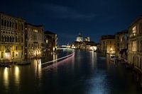 Nachtelijke huizen aan het Canal Grande met lichtsporen van de schepen