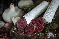 Kruidige knoflook - salami met kruiden op een houten achtergrond