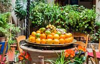 schaal met vers fruit zoals sinaasappels bananen mango in een patio met tropische bloemen en planten in Spanje