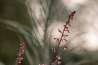 close up van een rode lentebloeier met kleine roze kelkjes, met een bokeh achtergrond van een andere plant, wat er als een schaduw uitziet