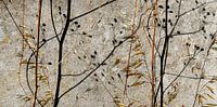 Beeld van dunne takjes en hun schaduw op een met cement besmeerde muur. De donkere schaduw van de uitgebloeide plantjes steekt duidelijk af tegen het bruingrijs van de muur. Je ziet de zaaddoosjes van de plant. Daaooverheen een foto van uitgebloeide wilde haver. Wilde haver wordt in Nederland bestreden, planten moeten worden gerooid…
