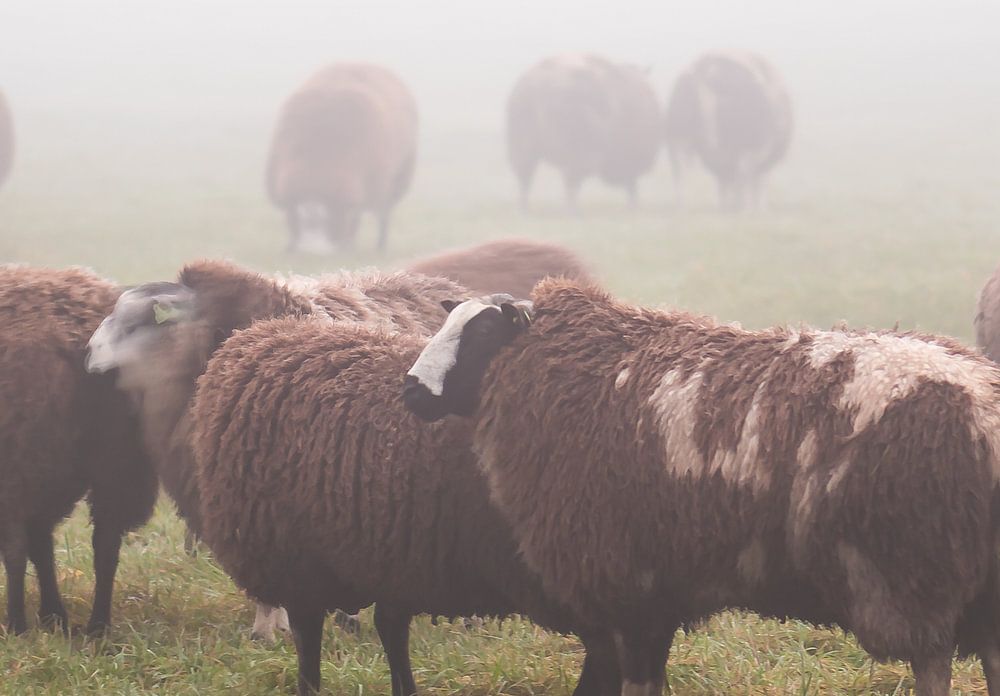 een weiland met bruine schapen, vroeg op een winter ochtend, waar het zicht beperkt is door de dikke mist
