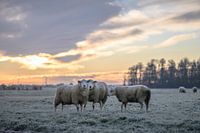 landschap in Homoet, Gelderland, tijdens een koude ochtend, met rijp over het weiland en de opkomende zon die voor een mooi gekleurde lucht zorgt