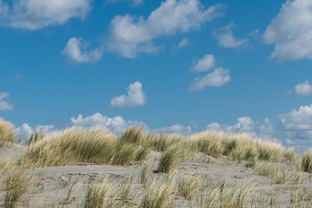 Heerlijk rustige zomers plaatje van een duin met mooie schapenwolken.