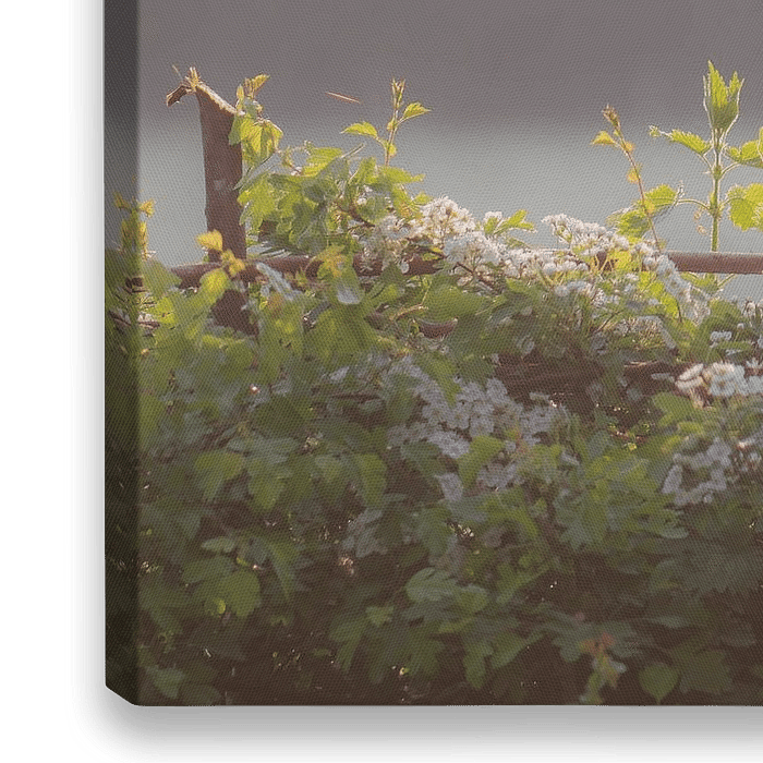 close up van een houten gevlochten omheining, helemaal begroeid met een bloeiende plant, in het zonlicht van de vroege ochtend