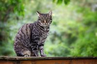 schattige tabby kat zit op een tuintafel tegen een groene achtergrond met kopieerruimte, geselecteerde focus