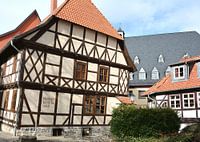 Leunend huis in de historische oude stad Wernigerode aan de rand van het Harz National Park in Duitsland. Het scheve huis uit het jaar 1680 is in de loop der eeuwen meer en meer aan één kant gezakt. Tegenwoordig is het gebouw in gebruik als museum.