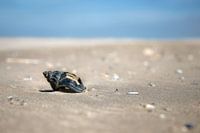 Schelpen spoelen aan dankzij hoge golven. Op het strand uit de noordzee. Een schelp met een mooie blauwe lucht. Al wandelend langs de kust kom je langs de mooiste plekjes op de waddeneilanden