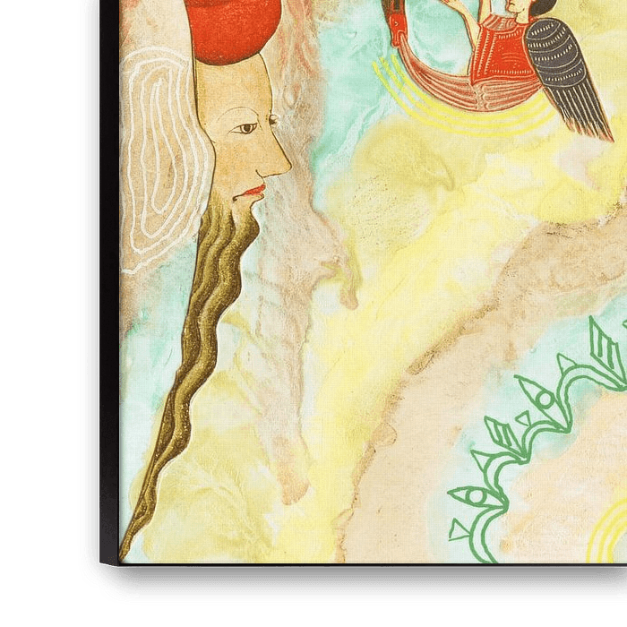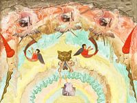 liggende collage achtergrond met uitlopende verf geschilderde bogen, kleuren verlopend van lichtgroen en lichtbruin naar rood in de rode boog driemaal de Oude van Dagen van William Blake (voorover buigende godsfiguur met passer) in de overige bogen verschillende mythische figuurtjes midden onder een knielende figuur op de rug gezien