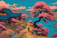 Geisha in tuin,schilderachtig Japan met fictieve personen in een japans fantasielandschap of omgeving