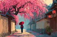 Geisha in tuin,schilderachtig Japan met fictieve personen in een japans fantasielandschap of omgeving