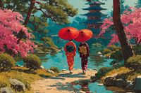 Geisha in tuin,schilderachtig Japan met fictieve personen in een japans fantasielandschap of omgeving