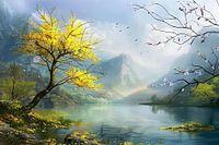 Digitaal beeld van schilderachtig Japan met fictief landschap of persoon.