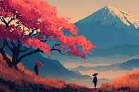 Geisha in tuin,schilderachtig Japan met fictieve personen in een japans fantasielandschap of omgeving