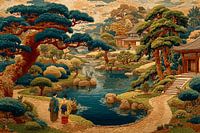 Geisha in tuin,schilderachtig Japan met fictieve personen in een japans fantasielandschap of omgeving