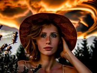 schilderachtige kleurrijke wolken en wolkenluchten boven een weids landschap met vrouw