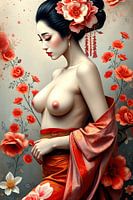schilderachtig fictief portret van Geisha met bloemen in felle kleuren en driedemensionaal diepte effect