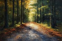 impressionistisch schilderwerk van een schitterend stil en sereen wandelpad tussen de bomen met vroeg ochtendlicht tijdens het opkomen van de zon dat tussen de bomen door op het pad valt