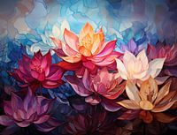 op olieverf basis geinspireerd schilderij van kleurrijke waterlelies in roze, paars en blauwe kleuren