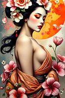 schilderachtig fictief portret van Geisha met bloemen in felle kleuren en driedemensionaal diepte effect
