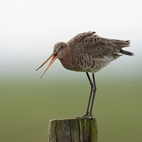 Black tailed Godwit / Uferschnepfe ( Limosa limosa), adult in breeding dress, perched on an old fencepost, watching above its territory, calling, warning, Europe.