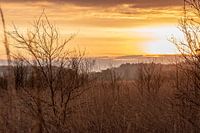 een landschap op nationaal park de Grote Peel, waar de begroeing met dauwdruppels schittert in het gouden licht van de zonsopkomst