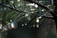 close up van een dennentak, waar de regendruppels aan de naalden hangen, wat gecombineerd met het zonlicht voor een mooie bokeh zorgt