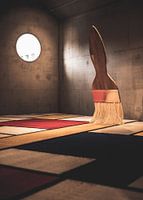 Kunstwerk in het schoen- en borstelmuseum Eperon d´Or in Izegem, West-Vlaanderen in België, waar een reuze kwast over een Mondriaan geïnspireerde vloer strijkt.