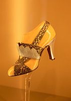 Close up van een schoen uit het begin van de 20e eeuw, tentoongesteld in het schoen- en borstelmuseum Eperon dÓr in Izegem, West-Vlaanderen, in België.