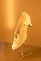Close up van een schoen uit het begin van de 20e eeuw, tentoongesteld in het schoen- en borstelmuseum Eperon dÓr in Izegem, West-Vlaanderen, in België.