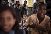 schoolkinderen in india. Enthousiaste kinderen zingen in schoolklasje in India