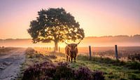 Prachtige foto bewerkt in olieverf stijl van een schotse hooglander koe in de heide naast een zandpad. Op de achtergrond een eik met de opkomende zon in een nevelig natuurgebied.