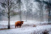 Schotse Hooglander in de sneeuw in het natuurgebied de boswachterij Dorst
