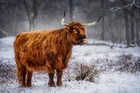 een schotse hooglander in de sneeuw in het natuurgebied Boswachterij Dorst . De goudgele vacht steekt fraai af tegen het winterse landschap
