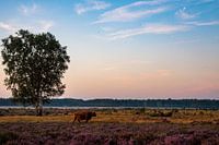 In de vroege ochtend op de heide bij Hilversum is deze foto gemaakt. Door wat meer afstand te nemen van het dier is de omgeving mooi in beeld gebracht