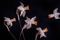 schreeuwende narcissen op zwart. Compositie van gedroogde narcissen op zwart. Vergane natuur op zwart. Bloemenkunst
