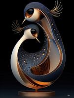 In een serene galerie, verlicht door zacht natuurlijk licht, stonden indrukwekkende sculpturen van dieren en mensen. Deze kunstwerken, uitgevoerd in de kleuren turquoise, donker goud en diep blauw, trokken onmiddellijk de aandacht van elke bezoeker.