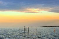 Met een wijntje in de hand slenter ik over het dek van de boot. Het laatste licht van deze zomeravond zakt langzaam weg en strijkt nog even langs de palen en boeien die in het ijsselmeer staan. Zo heerlijk rustgevend is dit panorama. Blauwe en gele kleuren contrasteren mooi en ik neem dit uitzicht nog een keer in me op. Rustig vaart de zeilboot verder naar andere bestemmingen op het ijsselmeer.