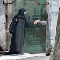 vrouw krijgt heimelijk een briefje in de handen geduwd door man achter deur.